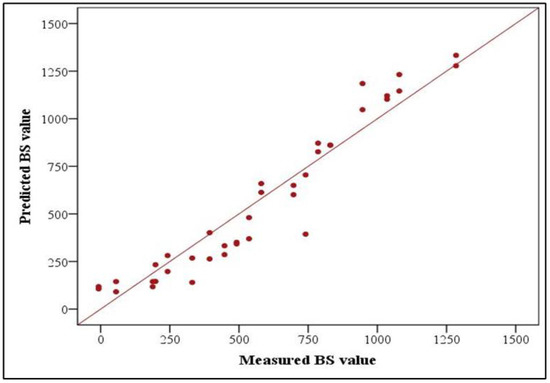 Results for the prediction of bruise susceptibility (BS) values based on the linear regression model. Predicted BS versus measured BS (Model 1).