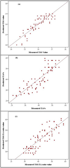 Results for the prediction of total soluble solids (TSS) (a), titratable acidity (TA%) (b), and sugar:acid ratio (TSS:TA) (c) values based on a linear regression model. Predicted TSS versus measured TSS (Model 2). Predicted TA versus measured TA (Model 3). Predicted TSS:TA versus measured TSS:TA (Model 4).