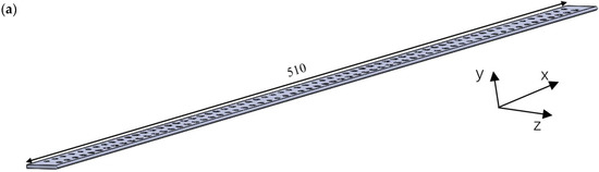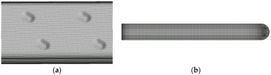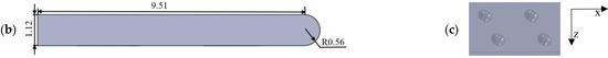 The geometric model is a long-length micro-tube with dimples, as shown in Figure 1a, whose length is 510 mm. The model as a whole consists of a cuboid with dimples on the upper and lower surfaces and a semi-cylinder. The length and width of the rectangle are 9.51 mm and 1.12 mm, respectively, and the radius of the semicircle is 0.56 mm, as shown in Figure 1b. The dimples are found between 22 mm and 488 mm of the X-axis. For upper or lower walls, the number of dimples is 106. The arrangement of dimples is shown in Figure 1c. The left and right rows of dimples are staggered, and the spacing of each group of dimples in the flow direction is the same. The detailed parameters of the micro-tube with dimples are given in Table 1.