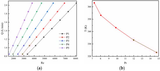 where subscript “in” denotes the inlet condition, is the hydraulic diameter, , and represent the cross-sectional area and perimeter at the entrance of the long micro-tube, respectively. Seven flow rates are about 0.85 L/min, 1.05 L/min, 1.25 L/min, 1.45 L/min, 1.65 L/min, 1.85 L/min and 2.05 L/min, respectively. Five inlet temperatures are about 363.15 K, 353.15 K, 343.15 K, 333.15 K and 323.15 K, respectively. Therefore, there are 35 working conditions, and the corresponding Reynolds number ranges from 1500 to 8100 (Cases R1 to R35). At the same time, the different Prandtl number ranges from 7.2 to 14.8 (Cases P1 to P5). The Prandtl number corresponding to working conditions R1 to R7 is P1, and so on for other working conditions. The flow rate and temperature corresponding to different Reynolds numbers and Prandtl numbers are shown in Figure 2. The flow rate increases with the increase of the Reynolds number, while the inlet temperature decreases with the increase of the Prandtl number.