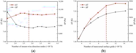 Figure 3 shows the evolution of the temperature drop and pressure drop with the number of grids for case R32. For the stream-wise direction, with the number of nodes increased, temperature drop increases and pressure drop decreases firstly and then gradually flattens, as shown in Figure 3a. Regarding the transversal surface, with the number of grids increased, the temperature drops and pressure drops increase first and then gradually flatten, as shown in Figure 3b. Thus, in this study, the number of nodes in the stream-wise direction and the number of grids in the transversal surface are 2806 and 9813, respectively. The total grid number is 24.91 million. The node diagram of the main structures is shown in Figure 4.