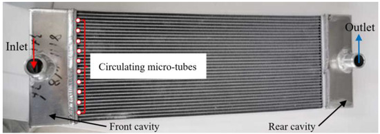 The transverse cross-section is so small that the experimental accuracy of the single long micro-tube is very difficult to guarantee. In order to obtain accurate experimental data, a multi-long micro-tube heat sink model, including 32 long micro-tubes, is designed, as shown in Figure 5. The model also includes inlet and outlet pipes, front and rear cavities, and fins. Among the 32 long micro-tubes, only 10 are in circulation, and there are two blocked tubes between every two long micro-tubes. Fins sandwiched between each long micro-tube to play a fixed role.