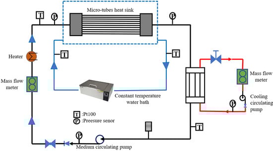 Figure 6 shows the outline of the long micro-tube heat sink system, including the heat flow loop and the cooling loop. Within the heat flow loop, heaters are used to provide different temperatures of coolant to the test sample. A pressure sensor (XPM4-5BG) is responsible for acquiring pressure data at both ends of the test sample. A mass flow meter (FMC-5101LA) is used to measure mass flow with high accuracy. The temperature at the entrance of the test sample was measured by a T-type thermocouple (PT100). The coolant is pumped by a gear pump to ensure high-precision flow. The main function of the cooling circuit is to provide a constant temperature environment for the test sample, including a constant temperature water bath and armored thermocouples.