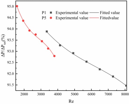 Figure 7 shows the ratio of pressure drop in the long micro-tubes to the total pressure drop. It can be seen that, with the increase of the Reynolds number, the ratio gradually decreases and then increases. Moreover, the ratio also has a relationship with the Prandtl number. On the whole, the value of the P5 case (low inlet temperature) is relatively large compared with the result of the P1 case (high inlet temperature).