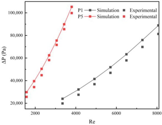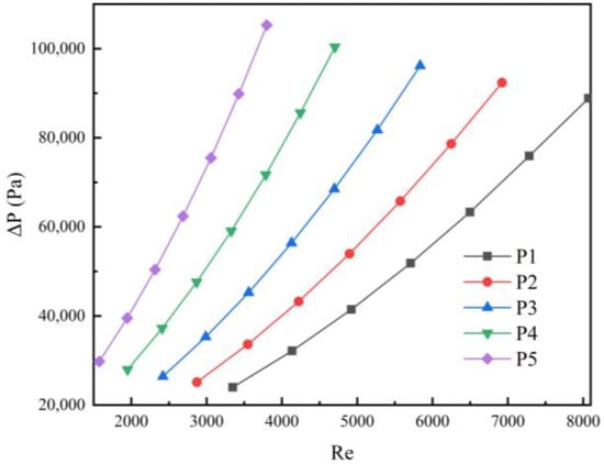 Under different Prandtl number conditions, the increasing trend of pressure drop with Reynolds number will not change, as shown in Figure 21. At the same time, the growth rate of pressure drop increases significantly with the increase of the Prandtl number. For example, the pressure drop under the P1 case is about 23,985~88,870 Pa, and that under the P5 case is 29,785~105,300 Pa.