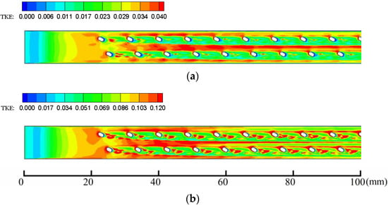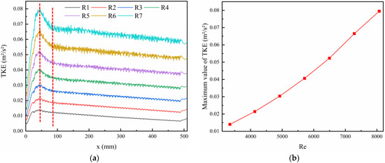 Figure 9a shows the distribution of the average turbulent kinetic energy (TKE). It can be seen that the TKE first increases to a maximum value. The maximum value of TKE sharply increases with the increase in the Reynolds number, as shown in Figure 9b. It increases from 0.026 m2/s2 for R1 case to 0.079 m2/s2 for R7 case. However, the position of maximum value remains at 43 mm and is insensitive to the Reynolds number. After a period of development, the evolution of TKE tends to be fully developed, whose position is located at 76 mm and also insensitive to the Reynolds number. In the fully developed stage, the TKE fluctuation can be observed, mainly caused by the dimples. In addition, for large Reynolds number conditions, the intensity of TKE fluctuation indicates that there existed a transitional stage.