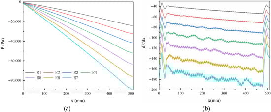 Figure 11a shows the mean static pressure in the different stream-wise positions. It can be seen that the mean static pressure decreases with the stream-wise position development for all cases. As the Reynolds number increases, the drop rate of static pressure increases. This phenomenon also can be seen in the average static pressure partial gradient in the stream-wise direction, as shown in Figure 11b. Moreover, the mean static pressure is distributed in three stages. With the increase of Reynolds number, the mean static pressure partial gradient amplitude of the middle stage, which includes dimples, decreases from −47.43 for the R1 case to −176.56 for the R7 case, and the fluctuation intensity also increases gradually.
