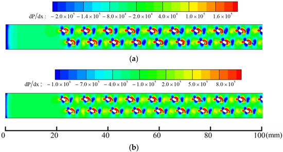 Partial gradient of static pressure in stream-wise component on (x, z)-planes at y/y0 = 0.68 for R1 (a) and R7 cases (b).
