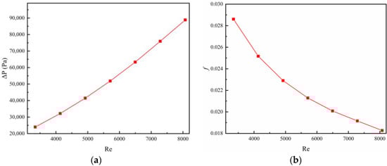 Distributions of pressure drop (a) and friction factor f (b) versus Reynolds numbers.