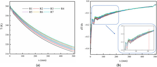 In Figure 14a,b, the mean static temperature and its partial gradient in the different stream-wise positions are shown, respectively. When the coolant first enters the dimple region, the static temperature drop rate will rise briefly. The rising range of mean static temperature can be revealed as its partial gradient, whose maximum value is about 25.62% for case R1 and 4.11% for case R7. It is indicated that the rising range decreases as the Reynolds number increases. With the progress of flow and heat transfer, the influence of the Reynolds number on the temperature drop rate gradually decreases. The maximum relative deviation of temperature drop between different Reynolds number conditions is less than 5% for x > 210 mm.
