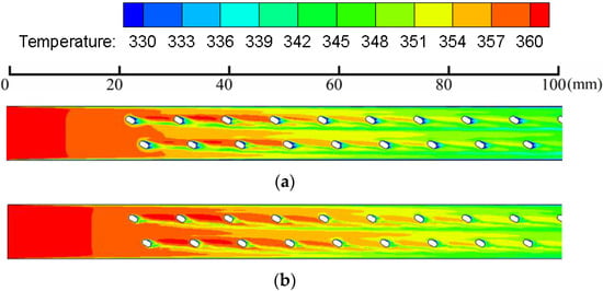 Figure 15 shows the static temperature on (x, z)-planes. Note that, similar to the flow field, the dimples will also cause temperature pulsations. The uniform distribution law of the temperature field is destroyed by the dimples. A low-temperature region appears behind the dimple and extends backward, driven by the detachment vortex. In the left region where flow separation occurs, the temperature is closer to the mainstream temperature. With the increase of the Reynolds number, the temperature drop rate slows down, the thickness of the temperature boundary layer near the wall surface is thinner, and the inhomogeneity of the temperature field distribution is further strengthened.