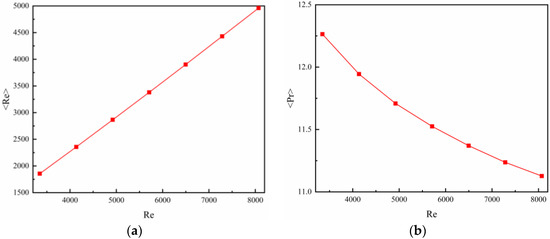 Figure 17 shows the changes in the average Reynolds number and average Prandtl number under different Reynolds numbers. Note that an obvious linear relationship between the average Reynolds number and the Reynolds number is observed, and the former increases with the increase of the latter. However, the average Prandtl number is negatively correlated with the Reynolds number.