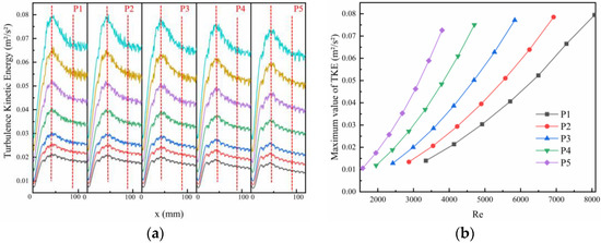 Figure 19 shows the distribution of TKE and its maximum value under different Reynolds number and Prandtl number conditions. The Reynolds number decreases gradually from top to bottom under the working conditions corresponding to each Prandtl number. Note that the positions of maximum value and full development are independent of the Prandtl number, which are still maintained at 43 mm and 76 mm, respectively. Although the evolution trend of TKE with the Prandtl number is similar, their maximum value gradually decreases with the decrease of the Prandtl number. When the flow equals 2.05 L/min, the relative deviation of the maximum value of TKE between the P1 case and the P5 case is up to approximately 10%. In addition, as the Prandtl number decreased, the intensity of TKE fluctuation decreased.
