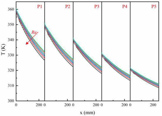 Figure 20 shows the distributions of mean static temperature with different Prandtl numbers within the first 250 mm. In the working conditions corresponding to different Prandtl numbers, the Reynolds number decreases gradually from top to bottom. Note that the relationship between mean static temperature and Reynolds number is similar for all Prandtl number cases. As the Prandtl number decreases, the rate of decline of mean static temperature increases. For example, for the first 250 mm, the mean static temperature drop is about 31.08~36.87 K for the P1 case and about 12.09~14.6 K for the P5 case.