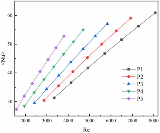 where subscript “out” denotes the outlet condition, is the wall temperature. With the increase of Reynolds number, driven by the larger area and strength of the detachment vortex, the degree of coolant mixing increases. More coolant participates in the heat transfer process, and the Nusselt number increases significantly. It can be seen that when the Prandtl number is constant, there is a quasi-linear relationship between the average Nusselt number and Reynolds number.