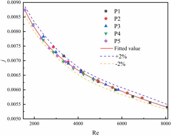 The exponential function decreases with the increase of the Reynolds number. The curve well reflects the relationship between heat transfer factor j and Reynolds number, and all relative deviations are within 2%.