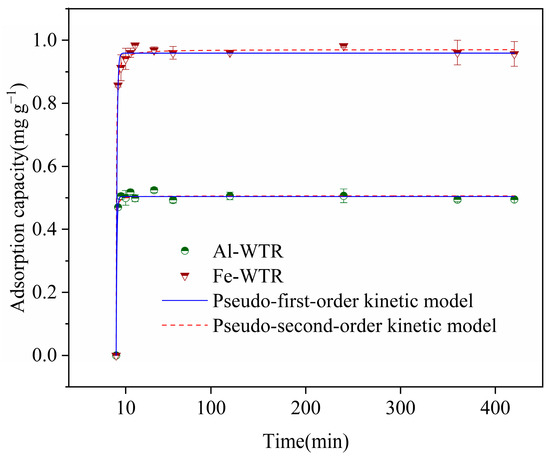 Figure 1 shows the Fe-WTR and Al-WTR adsorption kinetics for Tl(I). The adsorption of Tl(I) by Fe-WTR and Al-WTR occurred rapidly from 0–10 min. The absorptivities of Fe-WTR and Al-WTR both rapidly increased to more than 95% of the equilibrium adsorption capacity. This suggested that the adsorption of Tl(I) depended on many effective binding sites on Fe-WTR and Al-WTR surfaces. The adsorption equilibrium of Fe-WTR and Al-WTR for Tl(I) occurred within 120 min. After this time, the active adsorption sites on Fe-WTR and Al-WTR were saturated, which indicated that the systems reached equilibrium.