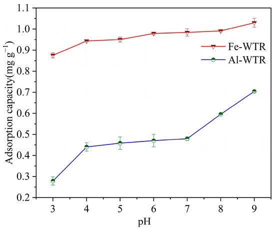 Figure 3 shows the effects of pH on Fe-WTR and Al-WTR Tl(I) adsorption. The adsorption capacities of Fe-WTR and Al-WTR gradually increased as the pH increased. The adsorption capacities of Fe-WTR and Al-WTR were 0.875 mg g−1 and 0.279 mg g−1, respectively, at pH 3. As the pH increased to nine, the adsorption capacities of Fe-WTR and Al-WTR increased to 1.030 mg g−1 and 0.704 mg g−1. The solution pH affected the WTR surface charge [51]. As shown in Figure 4, Fe-WTR and Al-WTR had isoelectric points of 3.05 and 3.97, respectively. The positive surface charge of Al-WTR decreased with increasing pH at pH < pHpzc, and the negative surface charge increased as the pH increased to pH > pHpzc. This was attributed to oxygen-functional groups on the adsorbent surface [81,82]. Therefore, at a pH of three, protonation of –OH-functional groups on Fe-WTR and Al-WTR increased the positive charge on the WTR surface. This enhanced electrostatic repulsions with the Tl(I) ion, which resulted in lower adsorption capacities for both WTRs. Conversely, the deprotonation degree of Fe-WTR and Al-WTR surfaces enhanced at pH > 3 and increased negative charges on the WTR surface. Electrostatic attractions between WTR and Tl(I) increased, which increased Tl(I) adsorption.