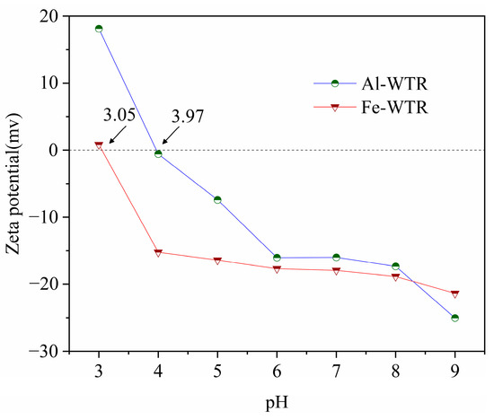Zeta potential diagram of Fe-WTR and Al-WTR.
