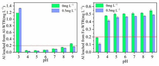 Although most studies consider WTR to be harmless [48] as a residue given to water plants, it contains more aluminum than most of the other metal components it contains, thus, posing a potential risk of aluminum contamination in applications [59]. From this, the influence of Fe-WTR and Al-WTR on the leaching of Al from Tl(I) solution and ultra-pure water under different pH conditions was compared, and the results are shown in Figure 5. The results show that the leaching concentration of Al in Fe-WTR and Al-WTR is related to the pH of the solution. The leaching concentration of Al in Al-WTR was less than 0.2 mg L−1 in both ultra-pure water with pH 4–8 and the Tl(I) solution with pH 4–9, which has achieved the Chinese standard for drinking water (0.20 mg L−1, GB5749-2006) [52]. Similarly, the leaching concentration of Al in Fe-WTR is only less than 0.2 mg/L at pH 3 but higher than 0.2 mg/L at pH 4–9 in both ultra-pure water and Tl(I) solution.
