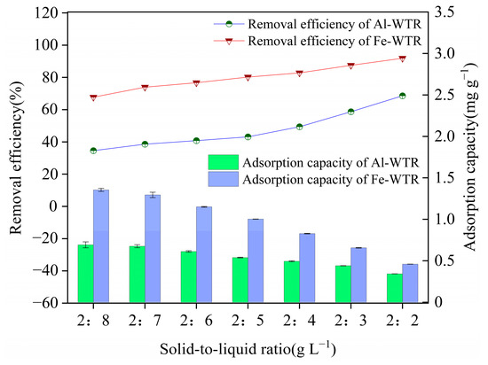 Figure 6 shows the Tl(I) adsorption and removal rate for Fe-WTR and Al-WTR. The removal rates of Fe-WTR and Al-WTR increased from 67.74% to 91.89% and from 34.60% to 68.59%, respectively, as the solid–liquid ratio increased from 2:8 to 2:2 g L−1. The adsorption capacity of Fe-WTR and Al-WTR separately decreased from 1.355 to 0.459 mg g−1 and from 0.692 to 0.343 mg g−1. Removal rates of Fe-WTR and Al-WTR both increased with solid–liquid ratio increases, while the adsorption amount decreased with solid–liquid ratio increases. Among them, the increased removal rate was caused by increased surface areas and adsorbable active sites for Fe-WTR and Al-WTR. However, the adsorption decrease was due to an increase of unsaturated active sites per unit mass of Fe-WTR and Al-WTR [70]. Under identical solid–liquid ratios, Fe-WTR had a greater adsorption amount and removal rate than t Al-WTR. This may be caused by Fe-WTR having a more abundant surface pore structure. This was confirmed by Fe-WTR (Table 1) BET analysis results.