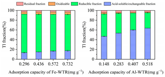 Figure 7 shows the fractional extraction Tl results in Fe-WTR and Al-WTR after adsorption by modified BCR. The forms of Tl in Fe-WTR and Al-WTR after adsorption were divided into the following four categories: (1) Acid-exchangeable (moiety bound to carbonate, dissolved salt, or exchangeable ion); (2) Reducible state (the part bound to iron manganese oxides); (3) Oxidizable state (the part bound to organic matter or sulfide); (4) Residual state (the part bound to silicate) [83,84]. Among those categories, the acid-exchangeable state readily migrated and transformed in the environment; however, the reducible, residue, and oxidizable states were less likely to migrate and transform [85].