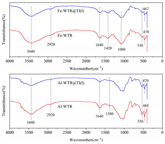 Figure 8 shows FTIR spectra used to evaluate functional group differences between Fe-WTR and Al-WTR before and after adsorption. The blank group (before adsorption) shows –OH stretching vibration peaks (3440 cm−1) [87,88], –OH bending vibration peaks (1640 cm−1) [54], and Al/Fe–O stretching vibration peaks (470 and 536 cm−1) on the WTR surface [89,90,91]. In addition, the peaks at 1040 and 1080 cm−1 correspond to Al–OH bending vibrations [92,93]. By comparison, after Fe-WTR and Al-WTR adsorb Tl(I), the peak intensities of –OH stretching and bending vibrations decreased significantly, which indicated that –OH groups on the WTR surface participated in Tl(I) adsorption. The Al/Fe–O stretching vibration peak intensities weakened slightly, with the peak of Fe–O stretching vibrations moving from 470 to 467 cm−1, and the peak of Al–O stretching moving from 468 to 470 cm−1. This indicated a strong interaction between Al/Fe–O metal oxide groups and Tl(I) [54]. This confirmed that the most critical active Tl(I) adsorption sites were the abundant –OH groups and Al/Fe–O groups on the Fe-WTR and Al-WTR surfaces. Studies have shown that the bending vibration of –OH was connected to the stretching vibration of Al/Fe–O [37]. This may stem from the complexation of Al/Fe–OH groups on Fe-WTR and Al-WTR surfaces, with Tl(I) forming Al–O–Tl or Fe–O–Tl complexes.