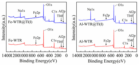 Figure 9, Figure 10 and Figure 11 show full XPS spectra, Tl 4f, and O 1 s XPS spectra of before and after Al-WTR and Fe-WTR adsorbed Tl(I). Both Fe-WTR and Al-WTR had a Tl 4f characteristic peak without spin splitting before adsorption, which was located at 119.02 eV and 118.98 eV, respectively, which was caused by the adsorption of trace Tl(I) in water during the process of water purification by water feeders. After the adsorption of Tl(I), two peaks were observed in Figure 10, which are generally defined as spin orbit splitting: Tl 4f7/2 and Tl 4f5/2, the spin-orbit splitting is 4.4 eV, with the bimodal energy of 119.31 eV, 123.7 eV and 119.04 eV, 123.5 eV, respectively. The distance between the two is 4.42 eV and 4.46 eV. It indicated successful loading of Tl(I) on Fe-WTR and Al-WTR [94,95]. The loaded Tl still exists as a cation (Tl+), which confirmed that no redox reaction occurred during the Fe-WTR and Al-WTR removal of Tl(I).