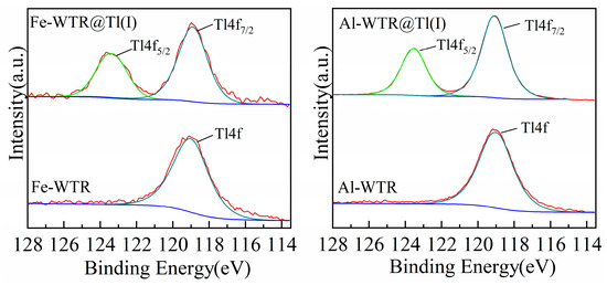 Tl 4f spectra of Al-WTR and Fe-WTR before and after adsorption.