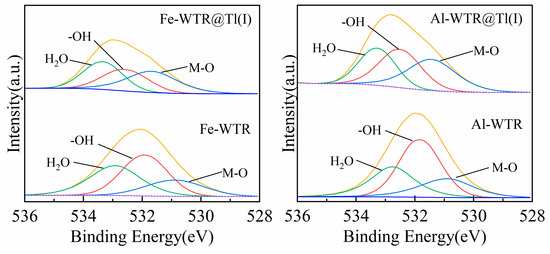 According to FTIR results (Figure 8), the functional groups of Fe-WTR and Al-WTR closely relate to Tl(I) adsorption. Therefore, the changes of oxygen-containing groups before and after adsorption were analyzed by measuring O 1 s XPS spectra. Three peaks with binding energies of 530.94, 531.82, and 532.76 eV were fit to the O 1 s peak prior to Al-WTR adsorption, which corresponded to metal–oxygen bond (M–O), hydroxyl (–OH) and adsorbed water (H2O), respectively [96,97]. After Tl(I) adsorption, metal–oxygen bond (M–O) levels increased from 21.80 to 34.75%, while hydroxyl (M–OH) levels decreased from 49.02 to 35.45%, and the adsorbed water levels increased from 29.18% to 29.80%, with binding energies of 531.42, 532.50 and 533.27 eV, respectively (Figure 11). Before adsorption, the O 1 s peak of Fe-WTR separated into three subpeaks with binding energies of 530.87, 531.92, and 532.94 eV, corresponding to metal–oxygen bonds, hydroxyl groups and adsorbed water [98,99]. After Tl(I) adsorption, metal–oxygen levels increased from 21.33 to 35.40%, hydroxyl levels decreased from 42.53 to 30.49%, and the adsorbed water levels increased from 36.14% to 34.11%, with binding energies of 531.67, 532.57, and 533.35 eV (Figure 11). After the adsorption of Tl(I) by Fe-WTR and Al-WTR, OH peak levels decreased significantly, while the content of M O peak increased significantly, and the oxidation state of Tl(I) remained intact. This confirmed the number of –OH and M–O group changes related directly to Tl(I) adsorption and indicated that adsorption may involve ion exchange of H+ in the –OH group and Tl(I) to produce Fe–O–Tl or Al–O–Tl complexes [100,101].