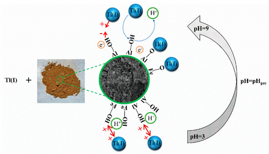 Aquatic ecosystem pollution, especially heavy metal ion pollution, is a worldwide environmental problem. Thallium (Tl) is extremely poisonous and classified as a dangerous pollutant in China and the US. It is also a carcinogen with higher toxicity than lead, cadmium, and mercury [1,2,3,4,5,6], and readily enters and accumulates in humans via drinking water, food, and respiration, and results in disease and disorders [7,8]. Compared with other harmful elements, such as Cd, Pb, and Hg, Tl pollution receives much less attention [9,10,11,12,13]. As a component of coal and certain metal sulfide ores, thallium wastewater production comes from numerous anthropogenic activities, such as mining, smelting, and other industrial processes, and results in serious water pollution [14,15,16,17,18,19]. Thallium pollution plays a significant role in the environment and society, particularly in China. For example, the Hejiang River in Guangxi in 2013, the Jialing River in Sichuan in 2017, and the Lujiang River in Hunan in 2018 all experienced serious water Tl pollution, and negatively impacted the health of residents in those areas [20,21,22]. Tl(I) and Tl(III) are the two more common oxidation states of thallium. Tl(I) has high solubility and fluidity in aqueous solutions; therefore, most thallium found in wastewater occurs as Tl(I) [23]. However, Tl(I) is a toxic trace and mobile contaminant that does not readily adsorb many natural materials [24,25]. Therefore, it is urgent and essential to explore Tl(I)-containing wastewater treatment methods.