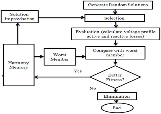 The basics of HSA: To find the best harmony, the musician first plays any tones or pitches from the pitches stored in his memory. Then, they play the other pitches that are close to the one from memory. After that, they play random tones from the possible domains. This method is used to find the harmony pitches, which is like the optimum solution in other applications. The Harmony Search Algorithm is based on a few steps where an initially estimated value from the harmony memory (HM) is then processed by this value. After that, the algorithm selects a neighboring value from the HS memory and uses other random values from the possible value limits. This method uses three rules controlled by two main parameters (HMCR), which means that the harmony memory considers the rate and the pitch-adjusting rate (PAR). Figure 3 shows the flowchart of the HSA method [33,34].