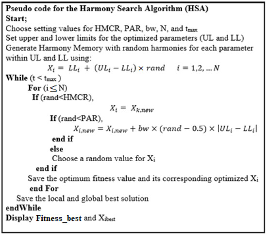 where, bw is the band width, and it is initially set before starting the iterations. For each iteration, the fitness is determined, and by the end of last iteration the optimum solution is displayed in addition to its corresponding optimized parameters. Figure 4 shows a pseudo code for HSA.