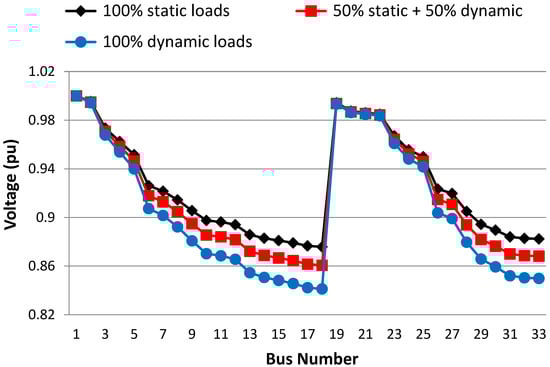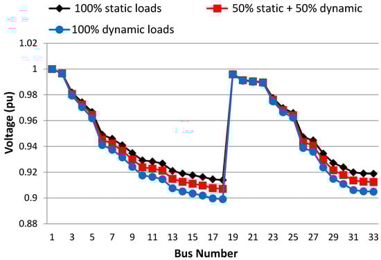 From the previous loading condition results, it can be concluded that the worst bus voltage profile with the highest system power losses happen in the 100% dynamic load type. Therefore, the 100% dynamic load type is considered in the evaluation of optimal siting and sizing of DGs performed in the next section.