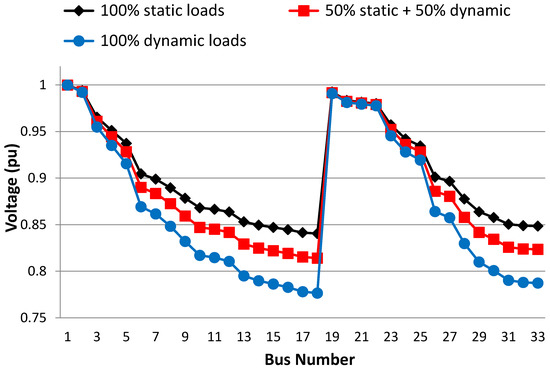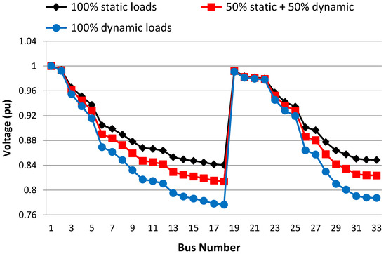 The first is the case at 100% loading, where Table 1 shows the system results at a normal case with no extra loading. The voltage profile in 100% static load is better than the other cases (50% dynamic and 50% static and 100% dynamic). Additionally, the power losses (both active and reactive) when the system is fully static are less than (50% static and 50% dynamic) and 100% dynamic. That means that static loading is better for the system.