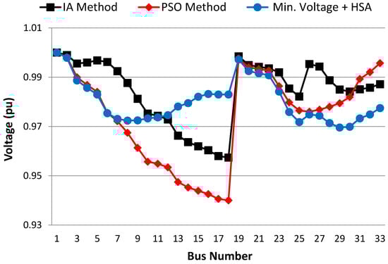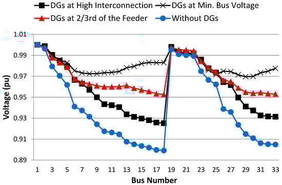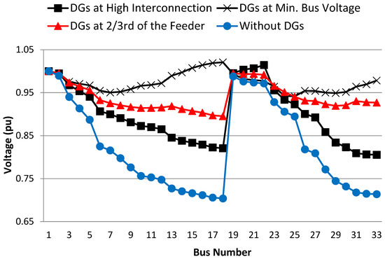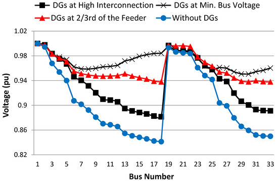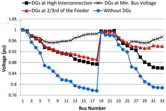 One of the disturbances that occurred at the far end of the radial distribution system, or in the rural areas, is the voltage dip. This resulted in several issues with loads and protective devices. The voltage profile can be supported and improved by using a tab changer transformer, a shunt capacitor switched on the feeder, and a transformer shifted towards the load center. According to several studies, the previous techniques can maintain the voltage within the required limit. According to [25], the location and size of DG have an important effect on the voltage profile. Additionally, when using the Improved Analytical method (IA), the minimum voltage exceeded the acceptable limit. According to the American National Standards, the voltage fluctuation of the distribution systems is within the range (+7% to −13%), but in practice, many companies keep the voltage fluctuation within ±6%, which should be considered in any solution suggested to enhance the voltage profile. One of the methods used to control the voltage profile on the customer’s side is proposed in [26]. The concept is the insertion of DG into the distribution system as a capacitor bank, with the DG units injecting real power or both active and reactive power—most DGs operate between 0.85 power factor lagging and unity power factor. Furthermore, the inverter is connected to photovoltaic, wind turbines, or any DC source to provide the system with a leading power factor. All the previous cases led to improving the voltage profile when selecting optimum locations and sizes, especially in rural and far-end areas of the distribution system. In some cases, the location of DGs in power systems can severely affect the system performance [27,28].
