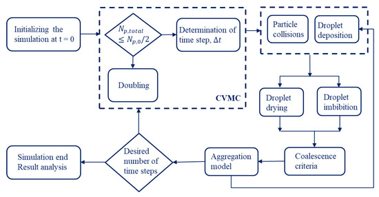 The simulation cell represents a sample of the particle population. Initially, the number of particles in the simulation cell is 1000, and it changes depending on the micro-scale mechanisms, such as agglomeration or breakage, that prevail during the simulation. However, breakage of already formed agglomerates is not considered in the present work, to first concentrate on the influence of the different milk powders (SMP and WMP) on growth. The agglomerates produced from the milk powders without a binder by glass transition are expected to be stable, but this assumption will have to be checked experimentally in future work. In the case of agglomeration without breakage, the particle population doubles at regular intervals when the number of particles in the simulation cell is halved. This type of particle regulation MC method is termed a constant volume MC (CVMC) model. The simulation scheme of the CVMC model is shown in Figure 1.