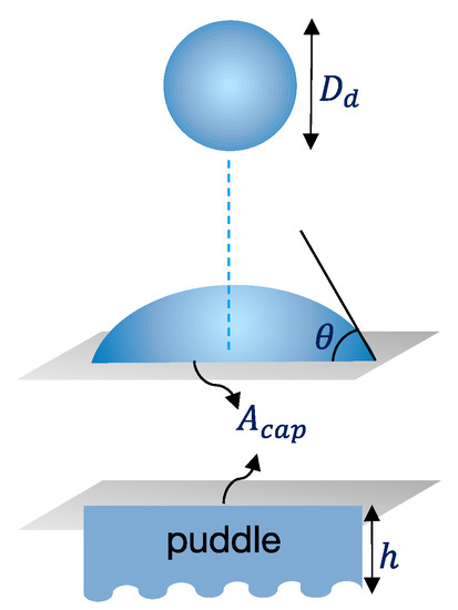 A schematic diagram of a droplet (with diameter, and cap area, ) deposition on the surface of soft PPs and the formation of a puddle (with height ).