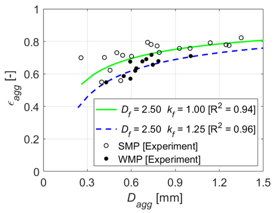 Experimentally formed agglomerates using skim or whole milk powder show a small but significant difference, as shown in Figure 4 (dots) [30]. The diameter of monodisperse agglomerates (with ) was calculated using Equation (11) by generating the aggregates by means of the MPTSA model at different pairs of fractal dimension and prefactors. The porosity calculated using the radius of gyration methods for agglomerates generated at different fractal values is shown in Figure 4 (lines). It shows that the WMP agglomerates have a fractal dimension of 2.50 and a prefactor of 1.25, while the SMP agglomerates have a fractal dimension of 2.50 and a prefactor of 1.00. The 2D fractal dimensions of milk agglomerates have been extracted by analyzing the 2D images [31]. When converting these 2D fractal dimensions into 3D using the correlation of [32], the resulting fractal dimensions are in agreement with the evaluated fractal dimensions from Figure 4.