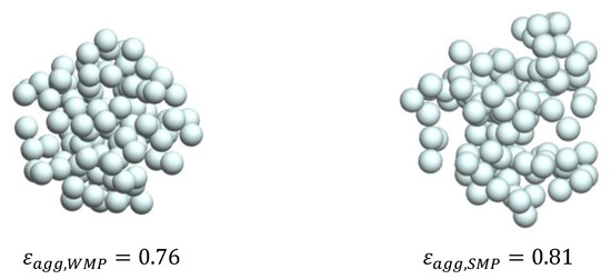 One WMP agglomerate and one SMP agglomerate with 100 PPs (), generated at their respective fractal properties by means of the MPTSA model [23], are exemplarily shown in Figure 5. It was concluded in [30] that the porosity of the WMP agglomerates is lower by 0.05–0.15 than the porosity of the SMP agglomerates. A similar conclusion was drawn regarding the porosity (calculated using the radius of gyration method) of the agglomerated whole and skim milk powders generated using the MPTSA model. The porosity of the WMP agglomerate is lower than that of the SMP agglomerate, as shown in Figure 5.
