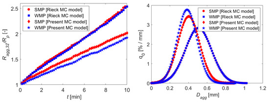 In addition, the particle size distribution (PSD) at different simulation times for both the whole milk and skim milk powder agglomeration is shown in Figure 6 (right). As expected, in case of the present MC model, the particles become larger for the SMP agglomeration, and the PSD shifts to the right compared to the WMP agglomeration. However, in the Rieck MC model, the PSD for both the SMP and WMP agglomerates is the same and broader as compared to the present MC model.