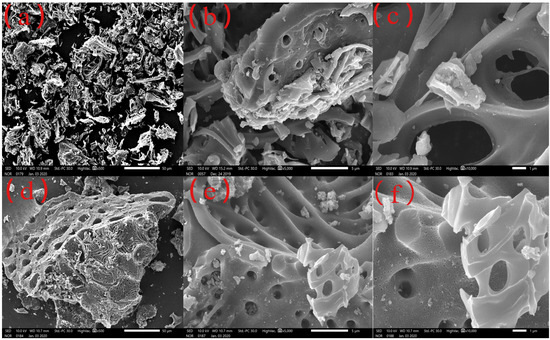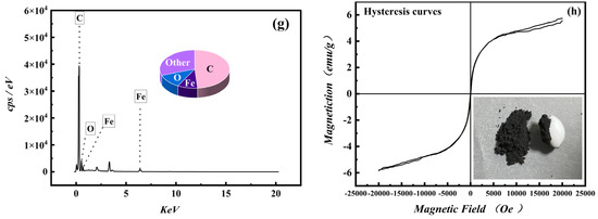 The micro-structure of Fe3O4-MOS and BC were determined by scanning electron spectroscopy as shown in Figure 1. The surface image of the prepared adsorbents were observed at various magnifications: 1 μm, 5 μm and 50 μm. The difference in the surface pore structure of BC and Fe3O4-MOS is not obvious. From Figure 1a–c it can be found that the number of BC pores is relatively small, and the distribution is relatively disordered. There are very few melted debris particles. Compared with BC, Fe3O4-MOS has a large number of fine pore structures, the pores are honeycomb, the arrangement is relatively neat, the appearance had changed significantly, and the crystals of varied agglomeration degrees covered the Fe3O4-MOS surface and filled in the formed pores (Figure 1d–f). This also explains why Fe3O4-MOS had rich pore structure, but its effective surface area and pore volume were small, as calculated from N2 adsorption-desorption data. In order to further determine the accompanying crystal composition, the EDS element analyzer was used to analyze it. As shown in Figure 1g, the crystal on the surface of Fe3O4-MOS contained 48.71% carbon, 9.24% of iron, 11.71% oxygen, and other substances. In addition, the magnetic hysteresis curve of Fe3O4-MOS was shown in Figure 1f, and the saturation magnetization of Fe3O4-MOS was 5.73 emu/g. Additionally, the sample strongly attracted to an external magnet, and showed the effective impregnation-pyrolysis extrusion of Fe3O4 to the Fe3O4-MOS.