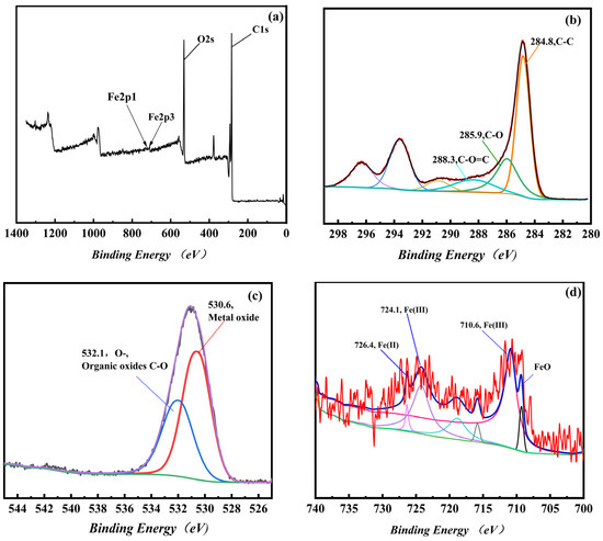 Figure 3 shows the XPS wide-scan spectrum of the Fe3O4-MOS. According to the whole-survey spectra of Fe3O4-MOS, surface elements of this adsorbent included carbon C1s (63.2 at.%), oxygen O1s (26.4 at.%), and iron Fe2p (1.57 at.%). As shown in Figure 3d, the binding energies of Fe2p were divied into five peaks. The peaks at 709.3, 710.6, 724.1 and 726.4 eV distributed to the Fe 2p3/2 and Fe 2p1/2 of Fe(III) and Fe(II), respectively [31], while the peak at 719.0 eV was the satellite peak [32]. The deconvolution of O1s peak showed (Figure 3b) two peaks, one at 530.6 eV and one at 532.1 eV, which arose due to the contribution of Fe-O, suggesting the load of FexOy on biochar [32] and organic oxides bonding C-O [33]. It was found from Figure 3c that the high energy C1s spectrum and the fitting curve of C1s can be decomposed into four peaks, at 284.8 eV, 285.9 eV, 288.3 eV and 290.74 eV, ascribed to carbon atoms in the C-C, C-O, C=O and O-C=O [34]. Furthermore, the absence of carbide eliminated the presence of Fe-C in the adsorbent.