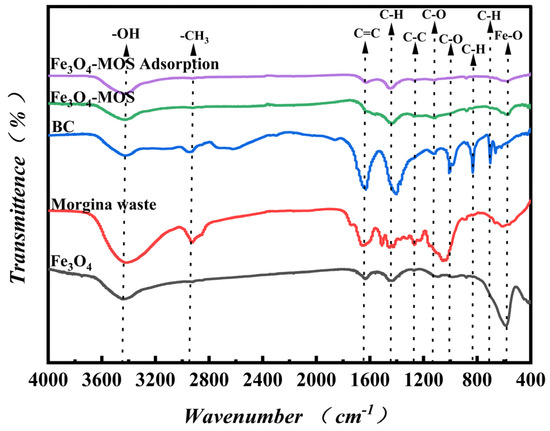After impregnation-pyrolysis, the functional groups of Fe3O4-MOS had obvious changes. The peaks at 663, 702, 1007 and 2945 cm−1 disappeared compared with BC. On the surface of Fe3O4-MOS, new peaks appeared. Similar to magnetic Fe3O4 nanoparticles, the wide band at 577.68 cm−1 was attributed to an asymmetric vibration of the Fe-O bonds [40] and the existence of Si-O-Fe bond could be explained by the presence of tiny peaks at 467.33 cm−1 , and the existence of Si-O-Fe bond could be explained by the presence of tiny peaks at 467.33 cm−1 [41], which confirmed the successful preparation of Fe3O4-MOS. The vibration peak at 577.86 cm−1 (Fe-O) of Fe3O4-MOS had a lower-than-before adsorption, which can be supposed that the dye was removed by combination of chemical bonds.