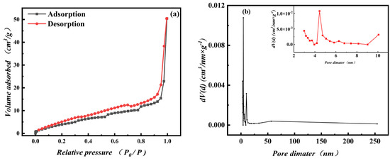 N2 adsorption isotherm (a) and pore size distribution (b) of Fe3O4-MOS.