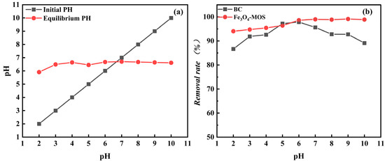 In the adsorption experiment of MB, which used as-prepared materials as adsorbent, it could be found from the Figure 6b that whether the Fe3O4-MOS or BC, the removal rate of MB increased with increases in the pH of solution from 2 to 6 (Fe3O4-MOS was 94% to 99%, BC was 87% to 98%). It was possible that protonation of the acidic functional groups, electrostatic repulsion between adsorbents containing H+ and cationic MB, and competition for adsorption sites between H+ and MB all contributed to the reduced adsorption capacity under acidic circumstances. With the increase of the pH, the functional groups of samples and the adsorption solution deprotonated, and negatively charged active sites were formed on the surface, which bound more MB anions through electrostatic interaction. The charged MB molecules exhibited the least electrostatic repulsion with the Fe3O4-MOS and the strongest π-π dispersion force when the pH of the MB solution was near to the pHpzc (6.7) of Fe3O4-MOS (Figure 6a). For BC, the removal rate of MB decreased from 98% to 90% as the pH of solution exceeded 6. As seen from Figure 4, there were more oxygen-containing functional groups on the BC than Fe3O4-MOS, it was easier to prompt n-π interactions between the oxygen electron pairs of hydroxyl group (n-electron donors) and the electron-depleted sites (π-electron acceptor) of BC, and the strength of n-π interactions increased with increased pH [44]. Therefore, the adsorption efficiency of BC would decrease as OH- competes with MB for access to the active site. However, fewer oxygen-containing functional groups would reduce the impact of OH− on Fe3O4-MOS, which explained why the removal rate of MB remained constant while the pH of the solution was raised.