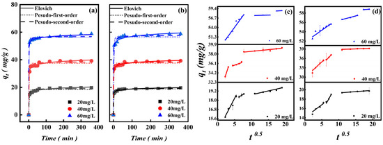 Adsorption tests were conducted with contact times spanning 0 to 360 min and at concentrations from 20 mg/L to 60 mg/L to determine the impact of contact duration on adsorption capacity. The effect of contact time at different concentrations was shown in Figure 8a,b. Fe3O4-MOS and BC both exhibited a similar behavior. Within 60 min, the adsorption capacity of BC could reach 19 mg/g (20mg/L), 38.12 mg/g (40 mg/L) and 55.20 mg/g (60 mg/L), respectively. And as for Fe3O4-MOS, adsorption capacities could be achieved of 18.8 mg/g (20 mg/L), 38.46 mg/g (40 mg/L) and 57.61 mg/g (60 mg/L), respectively. After 60 min, the adsorption capacity increased slowly and the entire adsorption process gradually became flat after 120 min. In the initial stage, a large number of effective adsorption centers existed and were exposed in the adsorbent, so MB molecules had a greater chance to contact and to be adsorbed. As the adsorption proceeded, the driving force of adsorbents to adsorb MB decreased, the effective volume of the adsorbent pores was continuously reduced and the number of adsorption centers was also drastically reduced. The effective adsorption of MB, then, increased slowly and then became saturated. Though Fe3O4-MOS (Figure 8a) and BC (Figure 8b) performed the same adsorption trend, Fe3O4-MOS showed better removal efficiency in the whole process of adsorption.