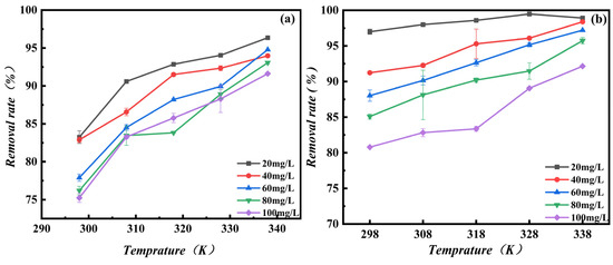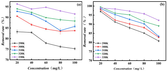 MB adsorption onto the adsorbents were heavily influenced by temperature in a significant way. The adsorption of MB onto Fe3O4-MOS and BC at different temperatures and five various initial mass concentrations of MB were studied. From Figure 9, it could be found that the removal rate of MB increased as the temperature rose from 298 K to 338 K, which suggested that adsorption of MB was an endothermic process. With the increase of adsorption temperature, and enhanced MB, the random mobility of MB was enhanced, the adsorption active sites was increased [52] which elimated the mass transfer resistance that would impede the adsorption process; it was reduced or completely eliminated [53]. In addition, the viscosity of solution decreases and the surface activity of dye molecules increases with the increase of temperature, which results in the diffusion rate of dye molecules on the adsorbent channel being accelerated [54]. Furthermore, there might form extra adsorption active sites on the adsorbent which enhance the adsorption capacity at a high temperature [55]. These reasons made the adsorption of MB become easier and faster with the increase of temperature. Due to the iron ions loaded Fe3O4-MOS were insensitive to temperature changes, and the removal rate of Fe3O4-MOS was more stable and higher as the temperature increased than was BC.