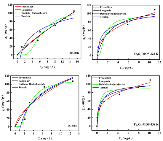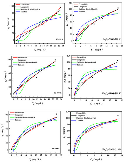 As shown in Figure 11, R2 was relatively near to 1, indicating that the experimental data were well correlated with the theoretical predictions (Table 3). According to the range of R2 of the above four models, the order is Freundlich > Langmuir > Temkin > D-R. These models explained whether BC or Fe3O4-MOS, in their adsorption of MB were non-ideal and multi-layer adsorption process on a heterogeneous surface. In addition, the high value of the n parameter in Freundlich indicated the presence of high energy sites for MB adsorption on the adsorbent surface and the value of 1/n below 1 implied a chemisorption of MB by Fe3O4-MOS and BC. As the adsorption temperature increased, the 1/n values of Fe3O4-MOS reduced from 0.60 (298 K) to 0.30 (338 K), indicating that the adsorption was more efficient at the higher temperature. Although the correlation coefficients for Langmuir isotherm (0.93–0.96) were significantly less than that of Fredunlich, the Langmuir parameter of KL represented the maximum monolayer saturation capability. As can be seen from Table 3, the values of KL gradually increased as the temperature increased, which indicated that the experimental conditions were suitable for the adsorption and the higher temperature were more favorable for the adsorption of MB on the Fe3O4-MOS and BC. Additionally, the bT value increased as the temperature rose from 298 K to 338 K, which established that the adsorption was endothermic. Furthermore, the value of mean adsorption free energy (E) calculated by D-R model determined the type of adsorption. The E values for two adsorbents were more than 8 KJ/mol, confirming the adsorption of MB on the as-prepared materials belongs to chemical adsorption process [1]. These conclusions can also be verified from the kinetic data.