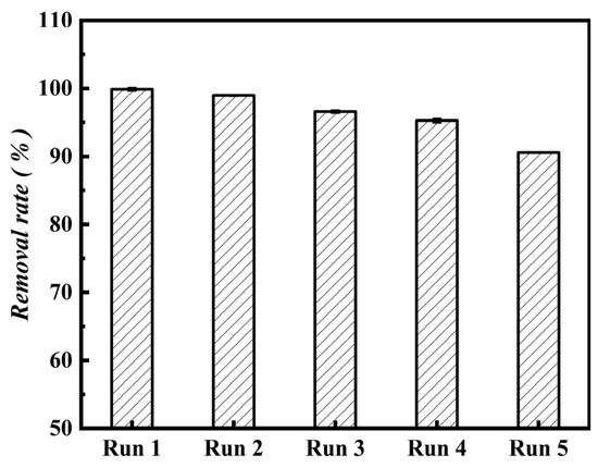 Practical efficiency and cost savings depend heavily on adsorbent’s capacity to be regenerated, reused, and steady. Previous researchers have recycled the adsorbents through washing away the adsorbed pollutants. This approach not only allows the pollutants to return to the water body, but also fails to realize the practical application goal of removing pollutants. In this study, the adsorb-saturated adsorbent was carbonized at 350 °C for 3 h, then were added at 1.0 g/L the regenerated materials to 40 mg/L MB, and reacted 120 min under 30 °C and 160 rpm/min. As shown in Figure 12, after five regeneration cycles, the rate of MB removal only went down by 9%, and the rate of MB removal was still close to 90%. Due to the dye molecules being adsorbed on the active center are separated under high temperature, the micro-pore structure of Fe3O4-MOS had no change. Fe3O4-MOS would be an excellent adsorbent for removing MB dyes from contaminated water, as shown by the collected results.